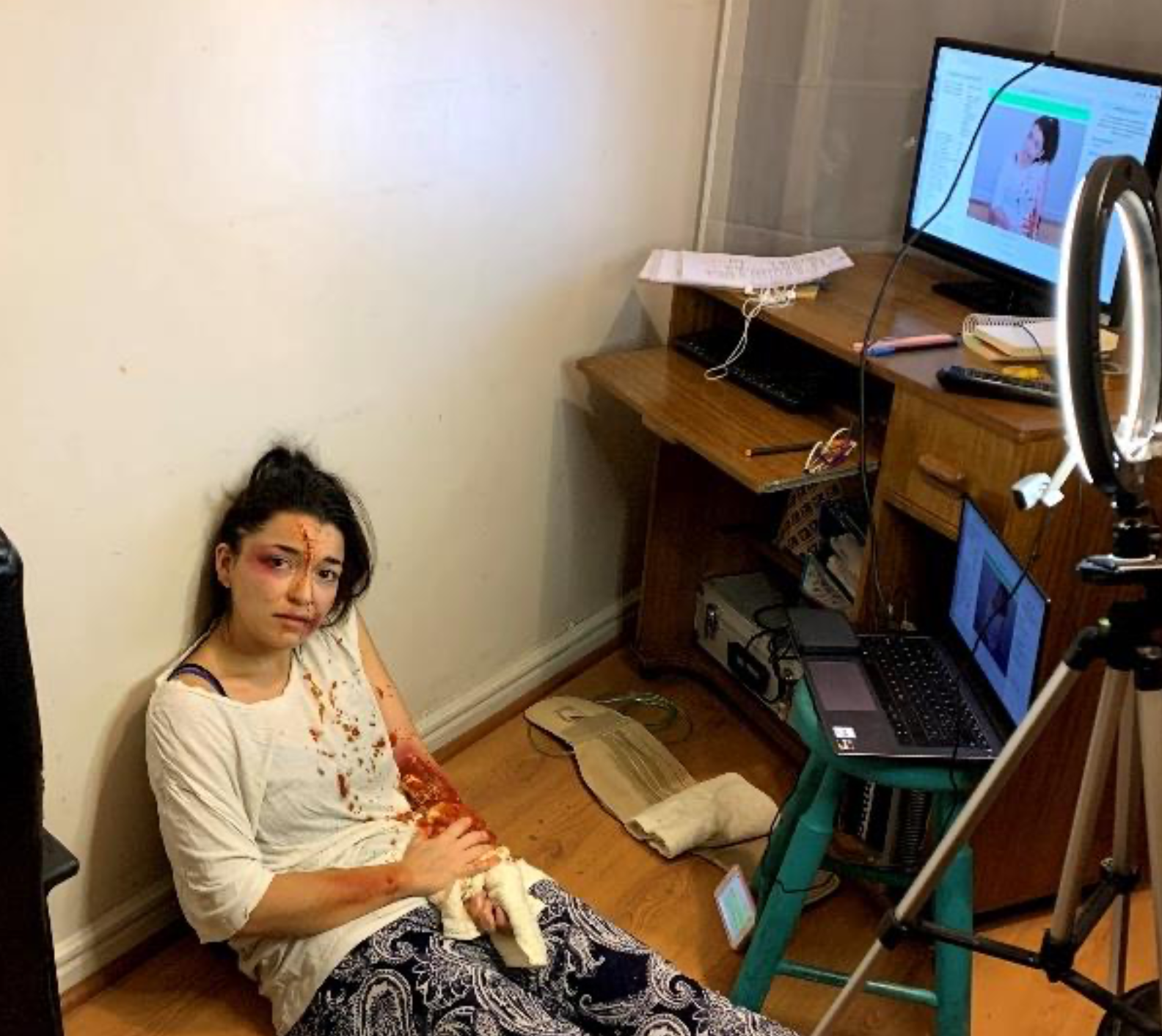 Yo fui la madre que visita la consulta con su hija para su control sano. Los estudiantes pedían el carné de la bebé y yo simulaba entregarlo hacia la cámara, momento en que la Doctora comparte la imagen de un carnet real para que los estudiantes puedan ver y conocer cómo se lee cada uno de los datos. Otro ejemplo, con el Doctor Pedro: Llegué como madre con su hija en brazos, con mucha fiebre y llanto. Para el examen físico simulé ponerla sobre una camilla a la vez que el doctor comparte imágenes y videos de cómo realizar un examen físico con un bebé real. Mientras la madre miraba y entretenía a su hija. Ambas imágenes fueron observadas por los alumnos de manera simultánea.